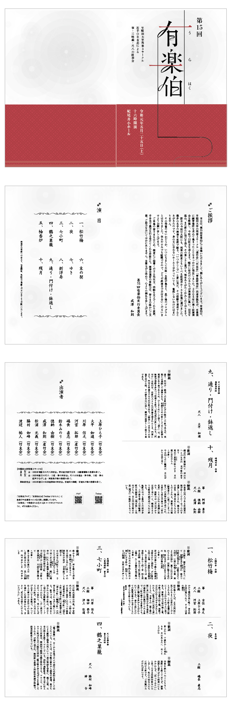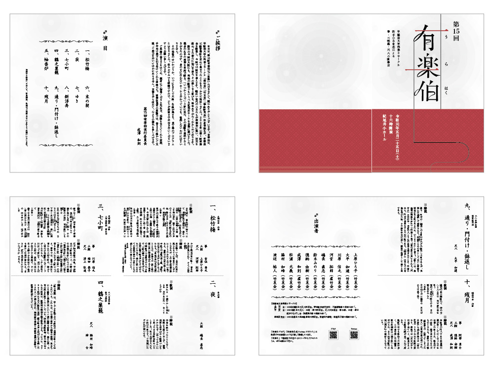 - 原稿を受け取りながらデザインを進行し、「有楽伯」というタイトル文字も和風テイストで独自に制作。全体のトーンを統一し、演奏会の雰囲気を引き立てるデザインに仕上げた。完成後はパンフレットを手に取った来場者から好評を得ることができました。