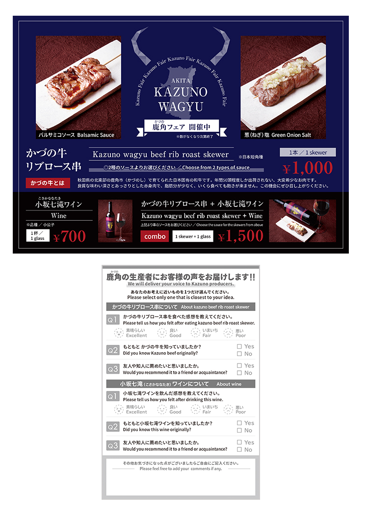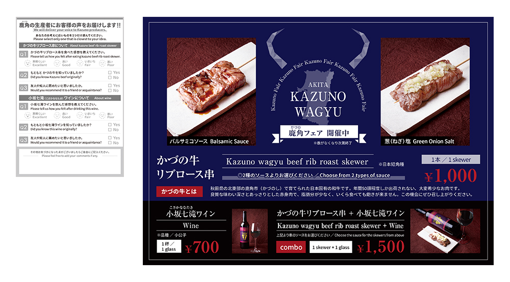 - 鹿角牛の概要を調査し、文章を精査・整理してメニュー表に反映。インバウンド向けに英語表記も調べて掲載し、誰でも内容を理解できるデザインを実現。結果、イベント来場者から「見やすく理解しやすい」と好評を得て、短期間での完売にも貢献しました。