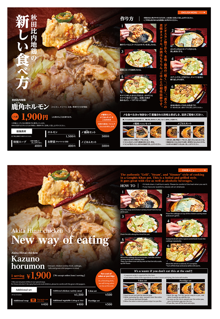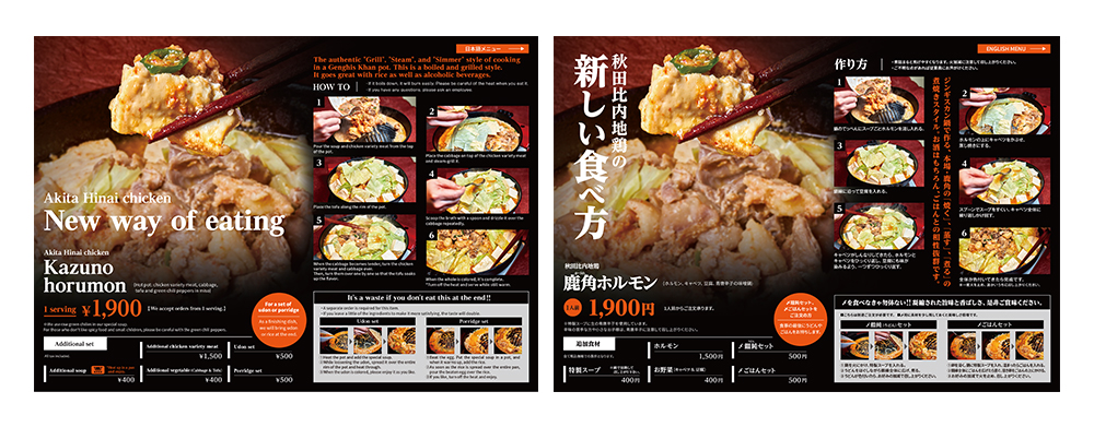 インバウンド向けに、海外の方でも理解しやすいメニューを制作。既存メニューのデザインを改訂し、料理内容や食べ方の説明を英語でもわかりやすく伝えることを目的としました。