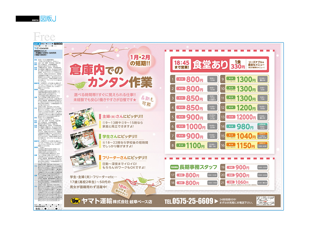 限られたスペースの中で情報を整理し、視認性の高いレイアウトを工夫。ターゲット層に訴求できるキャッチコピーや季節に合わせたデザインを心がけ、企業の雰囲気を表現しました。