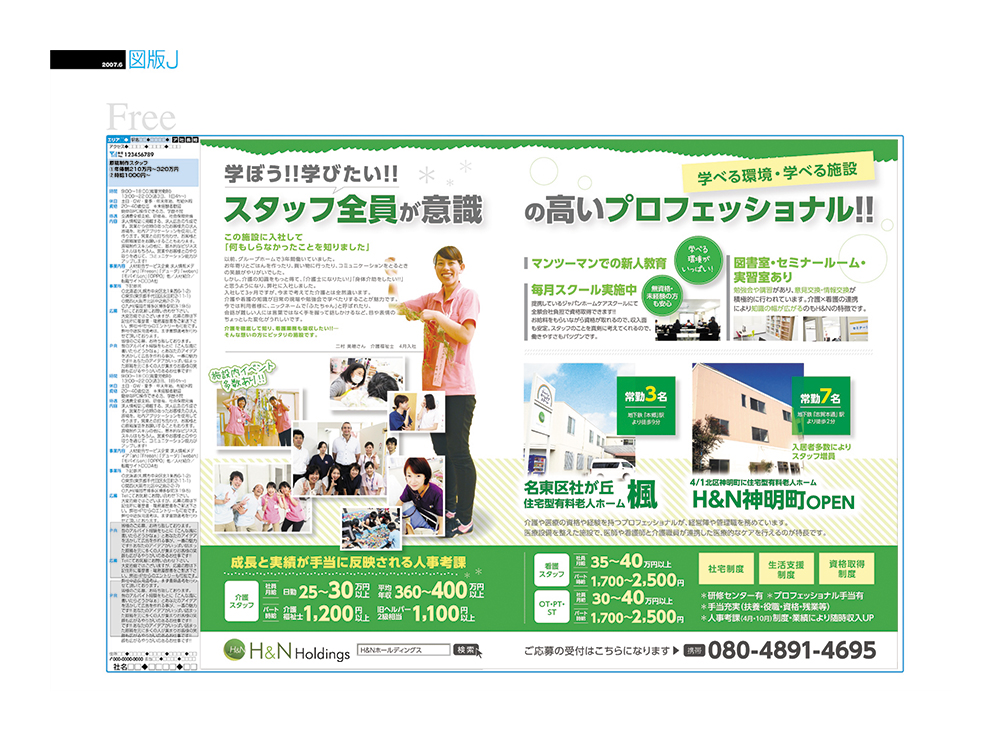 写真や配色に温かみを持たせ、介護の現場イメージをわかりやすく表現。限られた紙面の中で仕事内容や待遇など必要な情報を整理し、読みやすい構成に仕上げました。