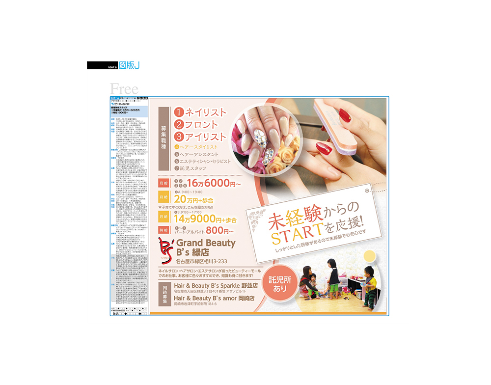 ネイリストの求人募集を目的とした広告デザイン。美容業界らしい清潔感を伝え、応募者に「働きたい」と思わせるデザインを意識しました。