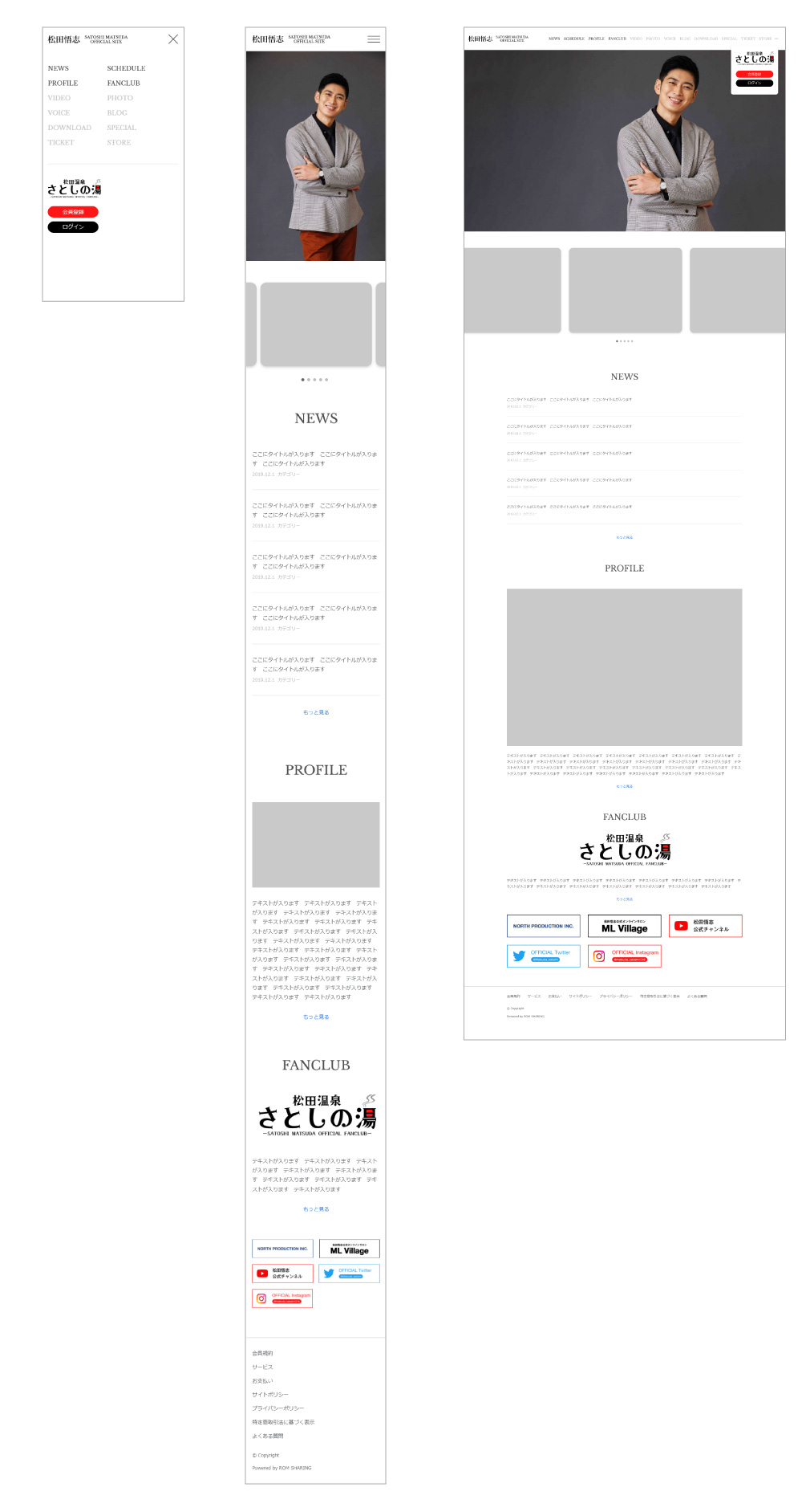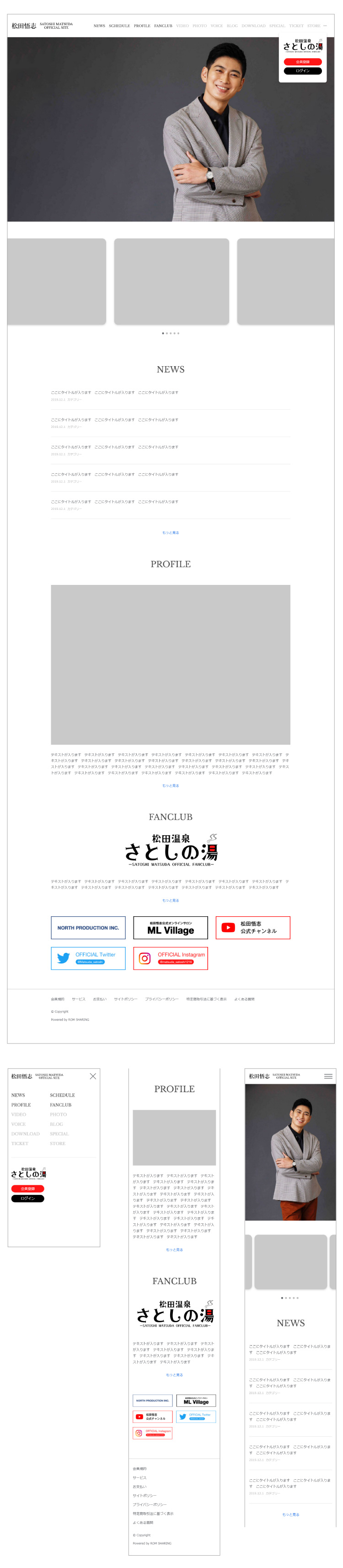 - 完全新規で立ち上げるオフィシャルサイトとファンクラブサイトの一体型構築。モデルテーマをもとに、CMS上で柔軟に運用できるデザインを実装し、投稿や事務ページも含めた管理体制を整備。