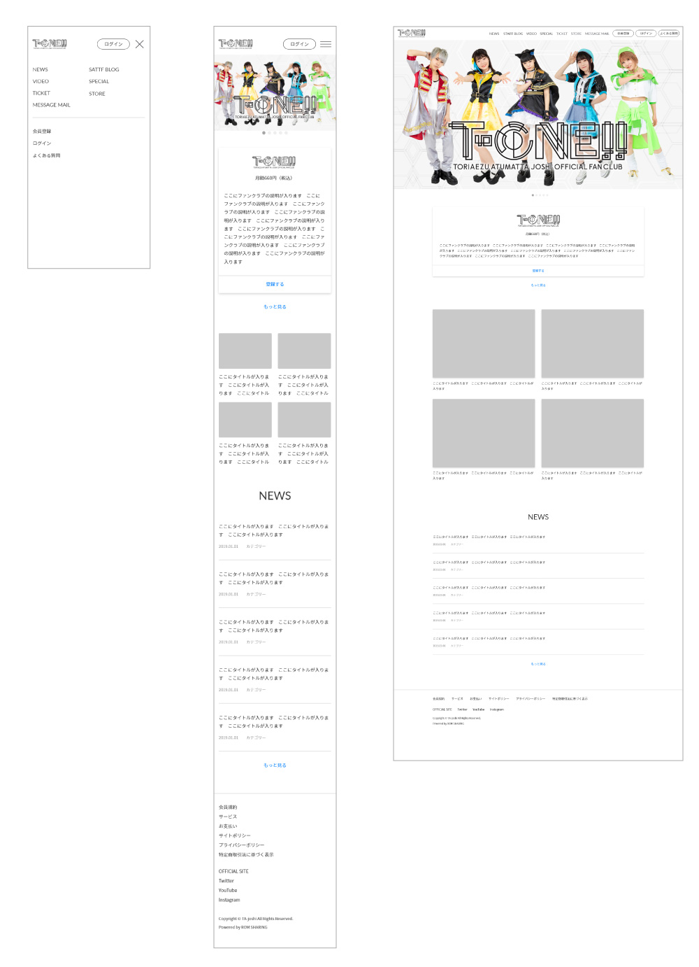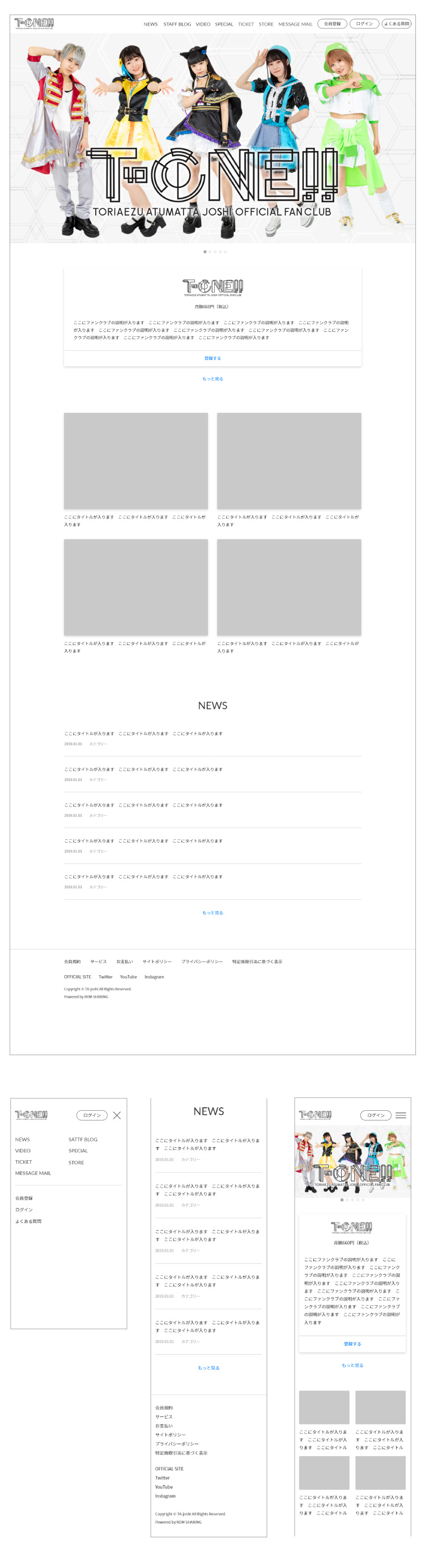- 完全新規で立ち上げるファンクラブサイトを、モデルテーマをベースにCMS上で構築。オフィシャルサイトとトンマナを合わせつつ、運営しやすいデザインと構造を実現することを目的とした。